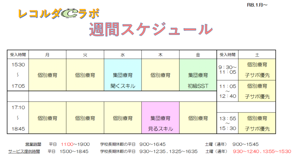・R8年1月13日~の新しいスケジュール表をUPいたしました。